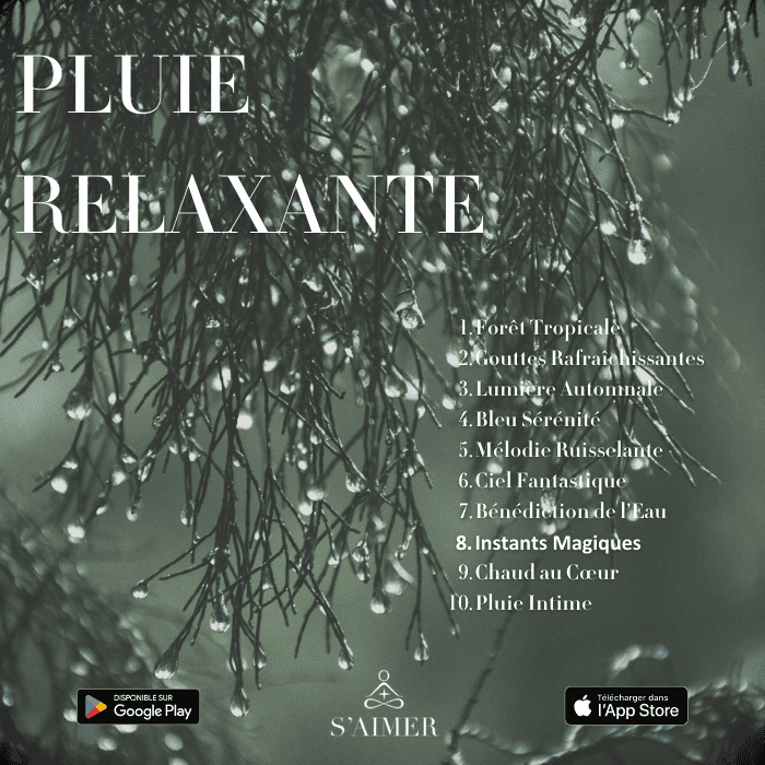 "Pluie Relaxante " vous fait accéder à une autre dimension. Explorez les forêts tropicales chamaniques qui reposent sous vos pieds et découvrez les forces régénératrices qui peuvent être libérées de votre moi supérieur. La faune, la flore, les énergies lumineuses ; tout contribue à votre transformation. Ressentez les vibrations des gouttes de pluie sur votre corps ; leurs fréquences nettoient et purifient toute l'énergie accumulée en vous et autour. Vous vous sentez rafraîchi et revitalisé grâce à l'eau, l'élément magique qui vous procure paix et guérison.